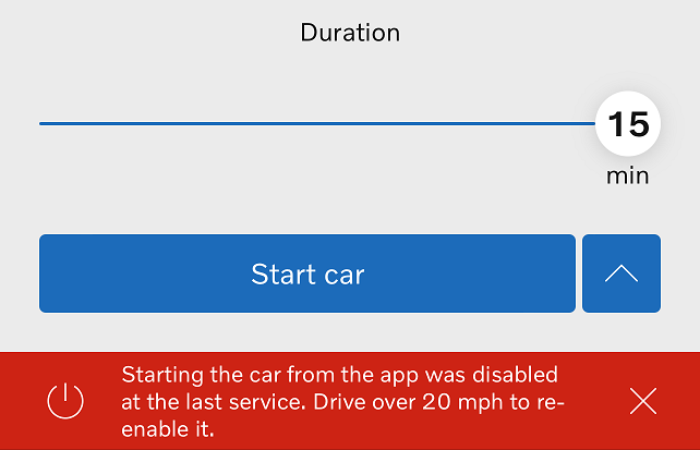 The message in the app looks like this: Starting the car from the app was disabled at the last service.