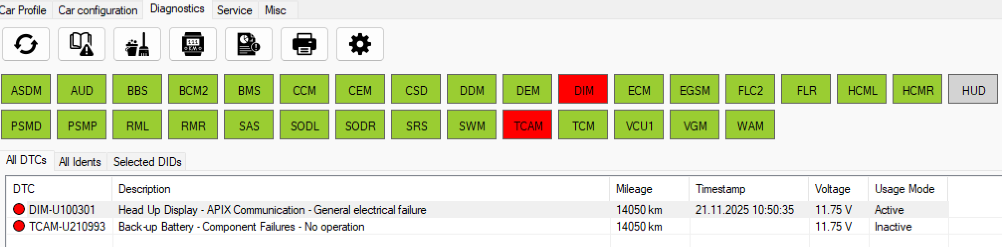 16:25:54 [Info]: Erased DTC for ECUs: ASDM, BECM, CCM, DIM, DDM, ECM, EGSM, TACM, IHU, IEM, IGM, HCML, HCMR, OBC, PDM, SRS, POT, PSMD, PSMP, PSCM, RML, RMR, SODL, SODR, SAS, SUM, TRM, TCM, CEM, WAM, AUD, ESM, VCU1, BCM2, FLC2, TCAM, VGM, FLR